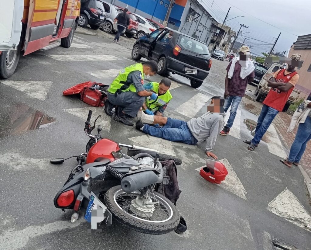 Na tarde desta sexta-feira, 23, por volta das 14h30, uma colisão entre motocicleta e automóvel deixou um motociclista ferido, na Rua Orlando Ferreira, no bairro Machados, em Navegantes.