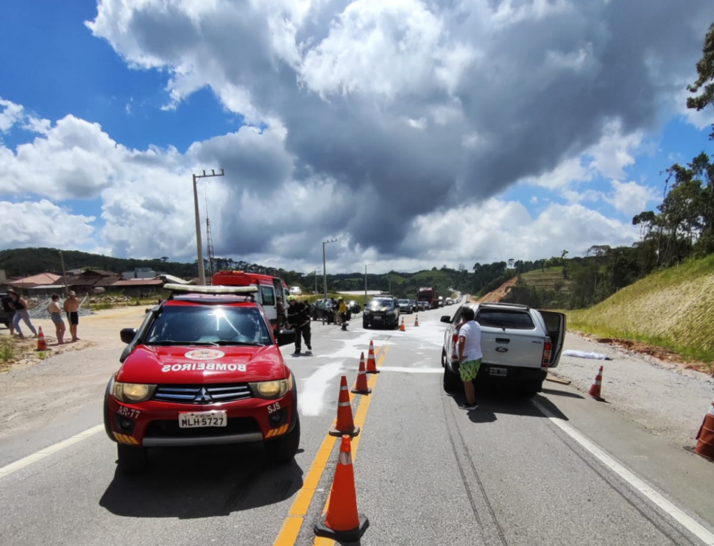 Na manhã deste sábado (4), por volta das 9h50, o Quartel de Rancho Queimado foi acionado pelo COBOM para atender a um acidente de trânsito no km 58 da BR-282, próximo à PRF. O acidente envolveu uma moto e uma caminhonete, com relatos de que o motociclista estaria preso sob o veículo. Para o atendimento, deslocaram-se as equipes AR-77 de Rancho Queimado, Bravo 08 do SAMU e a Polícia Militar local.