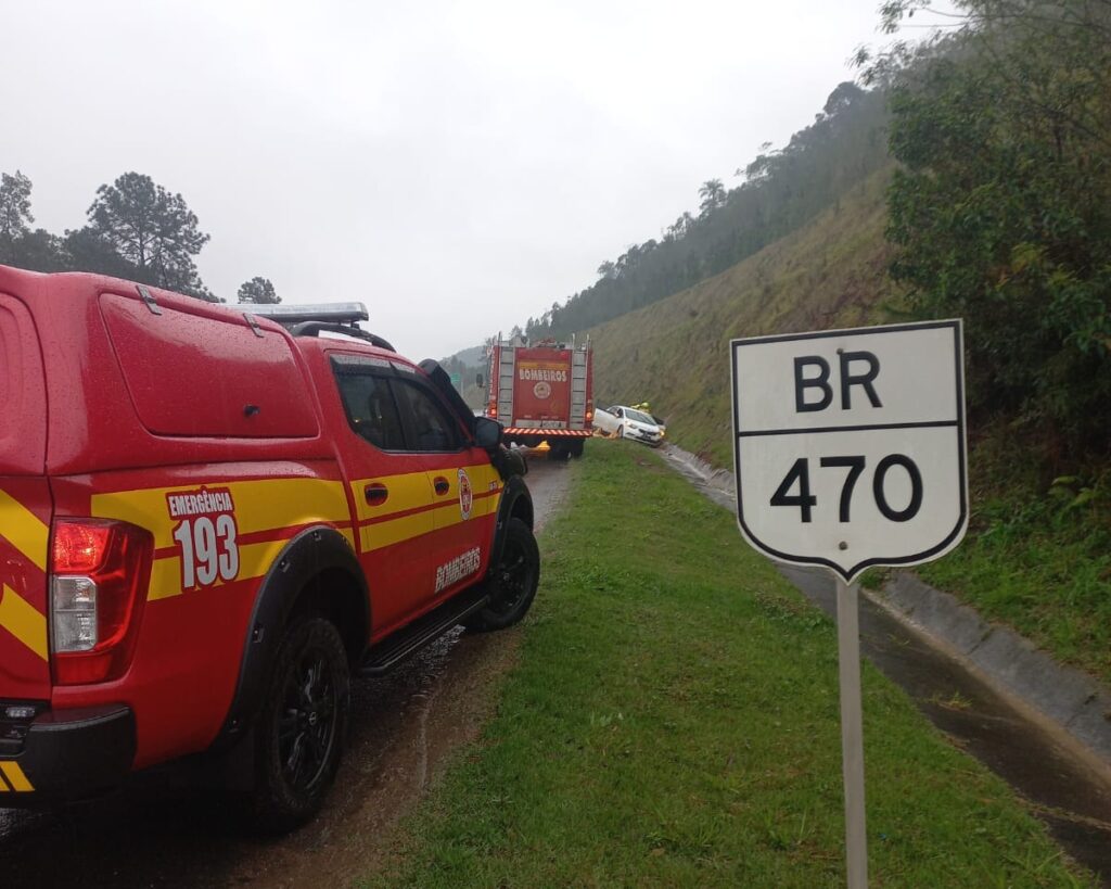 Na manhã desta terça-feira (26), o Corpo de Bombeiros Militar de Gaspar foi acionado para atender um acidente de trânsito na BR-470, nas proximidades do km 38, sentido Blumenau. Um automóvel Kia branco saiu da pista e colidiu contra um barranco, deixando a condutora ferida.