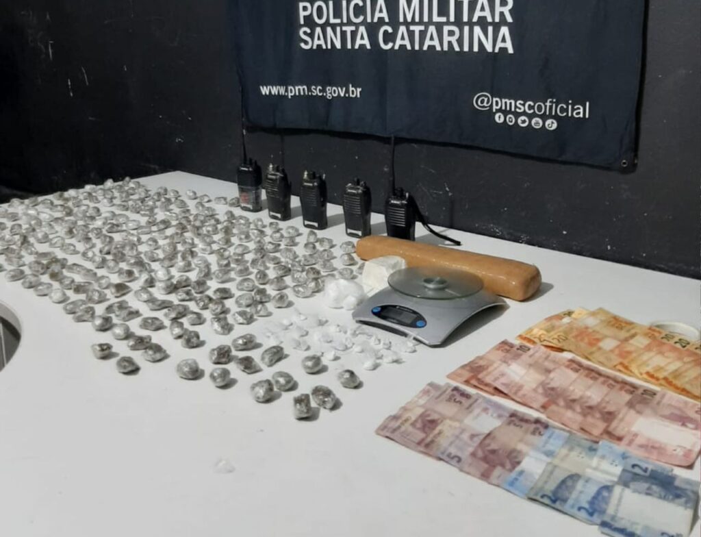 Durante a vistoria, a equipe encontrou dentro da mochila 244 porções de maconha embaladas para venda, além de um tablete da mesma droga. Ao todo, os entorpecentes somavam cerca de 1,1 kg. Também foram localizadas 18 porções de cocaína, totalizando 168 gramas, além de dois rádios comunicadores, uma balança de precisão e R$ 423 em dinheiro.