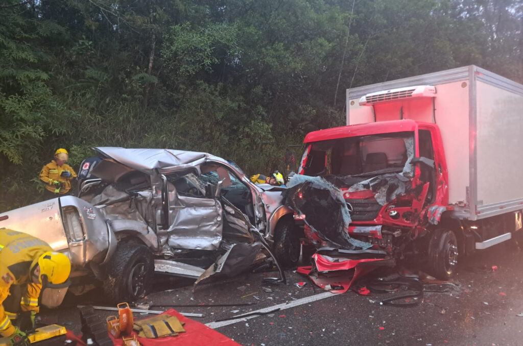 Um grave acidente de trânsito registrado na tarde deste sábado (28) deixou duas vítimas fatais na BR-282, em Santo Amaro da Imperatriz, na Grande Florianópolis. A colisão entre uma caminhonete Toyota Hilux e um caminhão ocorreu por volta das 16h30, no km 28 da rodovia federal.