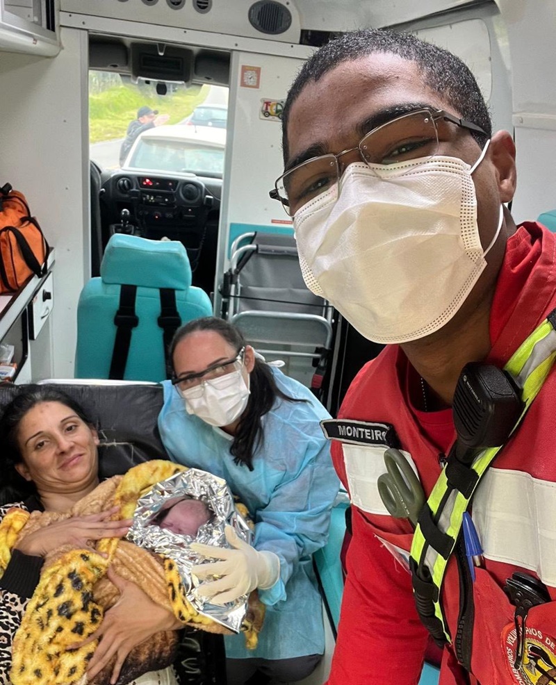 A socorrista Aline já se encontrava paramentada e auxiliou no parto do bebê de sexo masculino que nasceu as 9h27. Realizado os cuidados com o recém-nascido e com a mãe, corte do cordão umbilical, ambos estáveis.