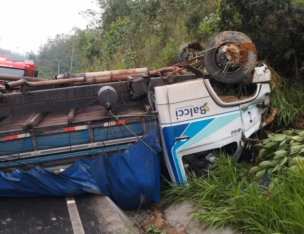 Segundo o condutor, ao acionar o sistema de frenagem o caminhão deslisou sobre a via, começou a balançar, perdeu o controle da direção e colidiu no barranco, vindo a capotar na sequência.