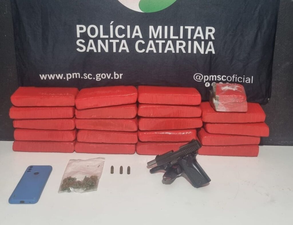 A Polícia Militar prendeu na madrugada desta sexta-feira (17), em Itajaí, dois homens por tráfico de drogas e porte ilegal de arma. Juntos com os supostos criminosos, os agentes encontraram uma pistola Taurus com três munições intactas e uma caixa de papelão com 19 tabletes de maconha pesando aproximadamente 11,9 quilos e, com um dos suspeitos, mais 6.6 gramas de skunk. O terceiro envolvido conseguiu fugir.