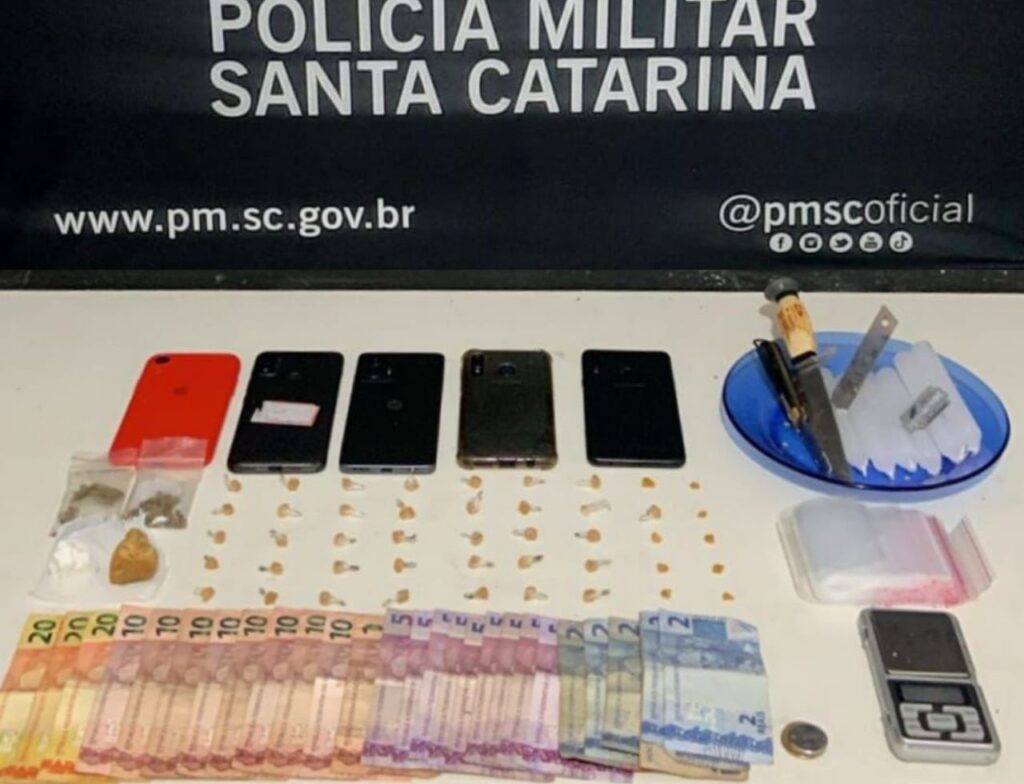 Na residência, os policiais apreenderam 11,9 gramas de cocaína, 31,8 gramas de crack (sendo 45 petecas prontas para venda), 3,4 gramas de maconha, R$ 210,75 em dinheiro, cinco celulares, além de facas, canivetes, velas, embalagens e uma balança, equipamentos usados no fracionamento e preparo das drogas.