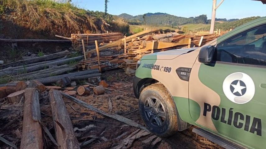 No local, os policiais encontraram 2m³ de toras da espécie Canela e 3m³ de madeira beneficiada — sendo 1,5m³ de Peroba (Aspidosperma polyneuron) e 1,5m³ de Canelinha-amarela (Nectandra lanceolata). A madeira estava armazenada sem a devida autorização dos órgãos ambientais.