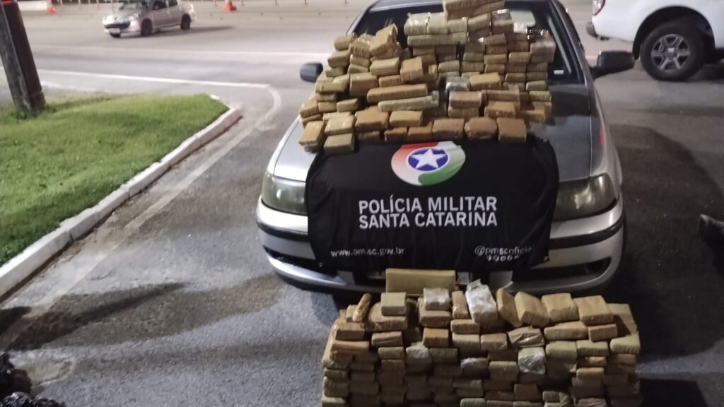 Durante a busca no veículo, foram encontrados cerca de 150 kg de maconha escondidos no banco traseiro e no porta-malas, ambos envolvidos em sacos pretos e cobertos por uma manta.
