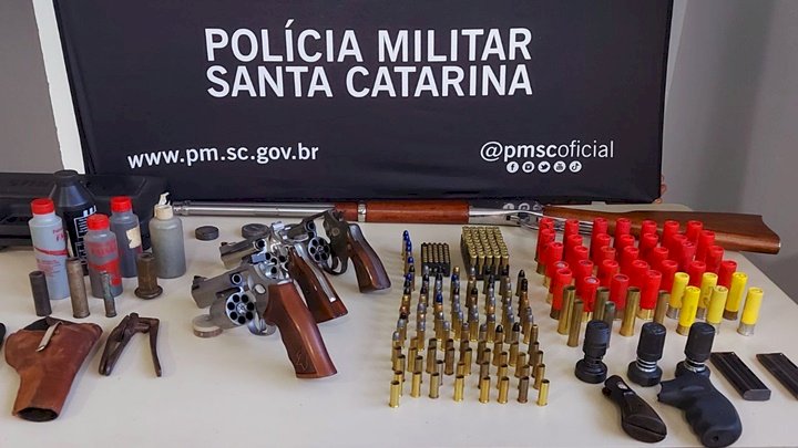 A Polícia Militar de Santa Catarina (PMSC) prendeu um homem por porte ilegal de arma de fogo na tarde de domingo (2), em Caxambu do Sul. A operação, realizada pelo 2º Batalhão de Polícia Militar de Fronteira (BPM/Fron), resultou na apreensão de três revólveres, uma espingarda e uma grande quantidade de munições. A ação teve início após uma denúncia levar os policiais a uma residência no bairro Antena, onde cumpriram um mandado de prisão contra o suspeito. Durante a abordagem, novas informações indicaram que o homem armazenava armas e munições em sua propriedade.