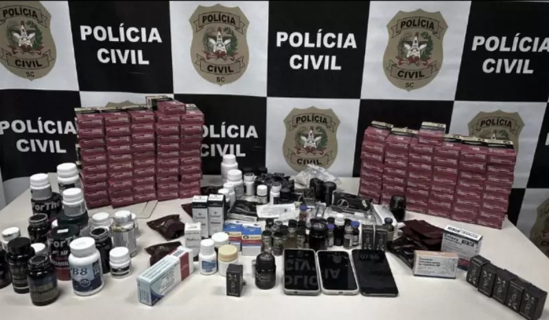 Na manhã de quinta-feira (6), a Polícia Civil de Santa Catarina realizou uma operação para capturar um empresário foragido da Justiça, acusado de fabricar e vender ilegalmente medicamentos controlados. A ação foi conduzida pela Delegacia de Combate a Estelionatos do Departamento de Investigações Criminais (DCE/DIC) e resultou na apreensão de 100 caixas de remédios tarja preta, anabolizantes, seringas e suplementos alimentares irregulares.