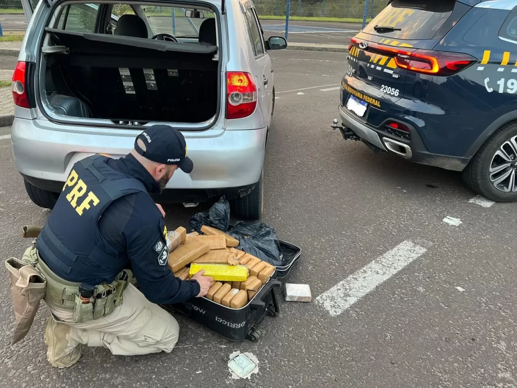 Os agentes da PRF deram ordem de parada a um Volkswagen/Fox com placas de Caxias do Sul (RS), que estava sendo conduzido por um homem de 30 anos, acompanhado por um passageiro de 22 anos. Durante a fiscalização, foram encontrados diversos tabletes de maconha no porta-malas do veículo, acondicionados em uma mala e um saco plástico, totalizando 45 kg do entorpecente.