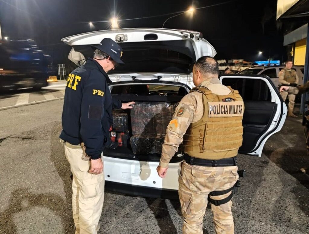 A abordagem ocorreu no km 11 da BR-101, sentido Sul, após troca de informações entre as forças de segurança. Os policiais localizaram o veículo suspeito e, durante a vistoria, encontraram no porta-malas fardos contendo dezenas de tabletes da droga.