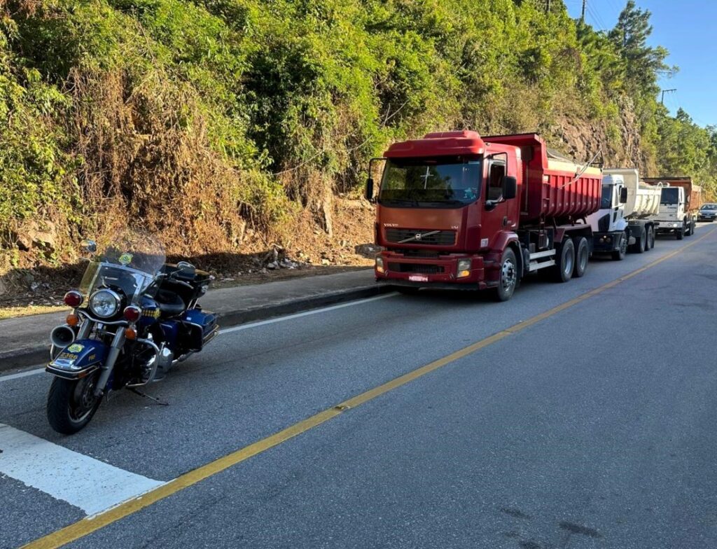 Na manhã desta quinta-feira (20), a Polícia Rodoviária Federal flagrou, na BR-101 em Biguaçu, cinco caminhões com excesso de peso. Juntos, os veículos transportavam 54.000 quilos a mais do que o limite permitido, todos carregando pedra brita de uma pedreira local. A carga excedente foi transferida para outros caminhões antes que os veículos pudessem continuar viagem.