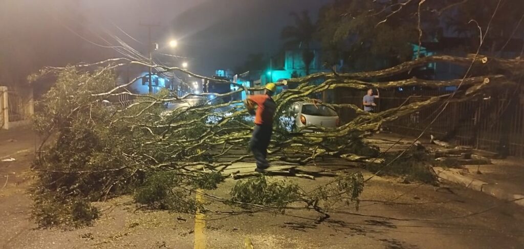 O vento e a chuva provocaram a queda de uma árvore na noite dessa quinta-feira, 08, por volta das 23h30, na Rua Amaro José Pereira, no bairro Coloninha, em Araranguá.
