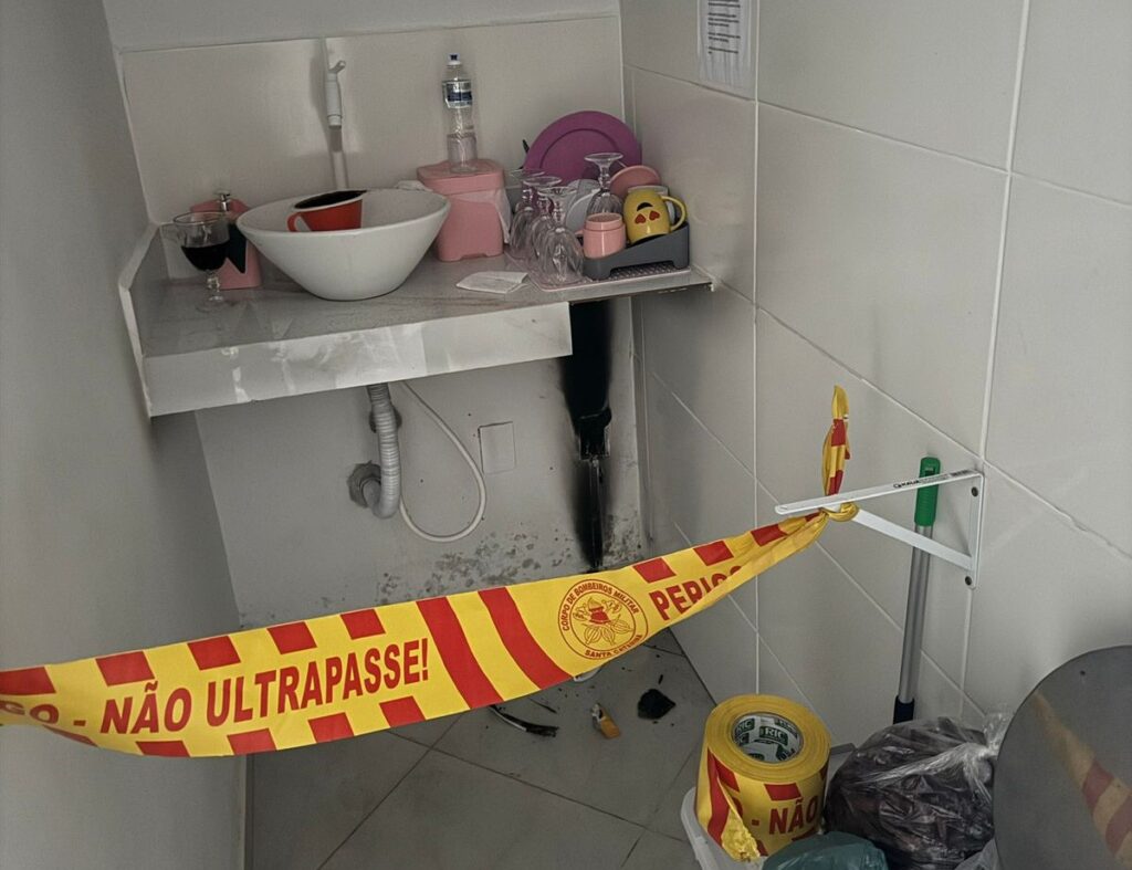 Em uma das salas comerciais do pavimento térreo foi verificado curto circuito em um equipamento de aquecimento elétrico de água.