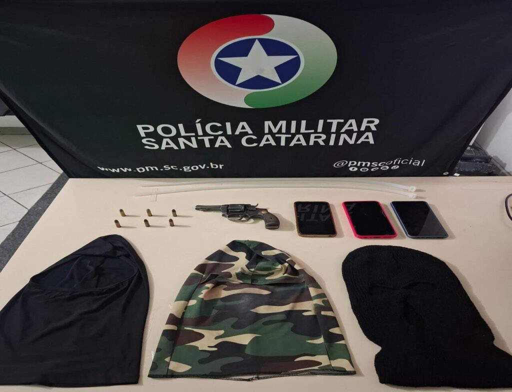 Entre os itens encontrados estavam três toucas “balaclavas”, duas fitas conhecidas como “língua de sogra”, três celulares e roupas pretas, que, segundo a polícia, poderiam ser utilizadas em assaltos na região.