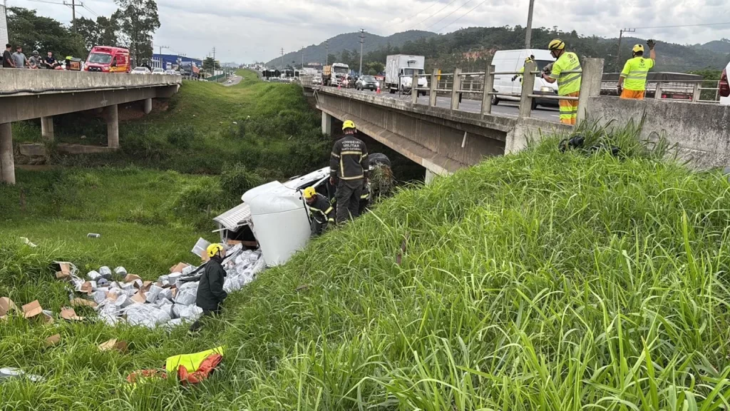 No fim da tarde desta quarta-feira, 27, por volta das 17h, um caminhão carregado com espuma de isolamento acústico caiu de cima de uma ponte, na Rodovia BR-101, próximo a um córrego, no bairro São Cristóvão, em Tubarão.