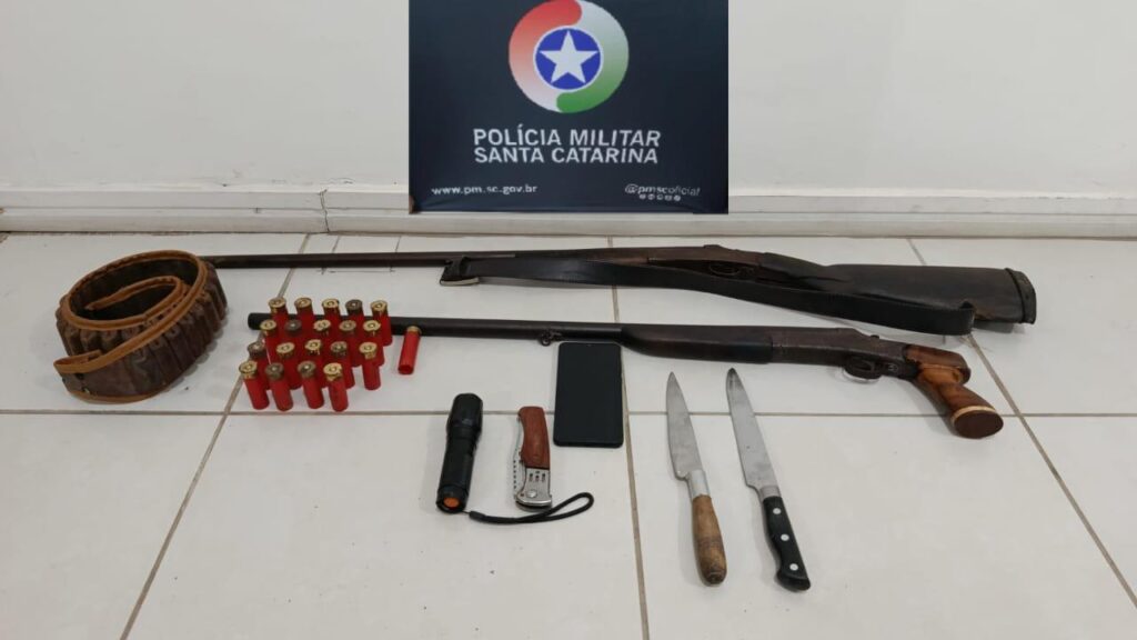 Com o suspeito foram encontrados os materiais levados, sendo eles: uma espingarda calibre 16, uma espingarda calibre 12, 19 munições calibre 16, além de objetos pessoais do autor, como um aparelho celular, duas facas, um canivete e uma lanterna.