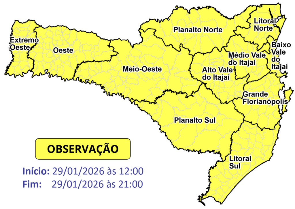 A Defesa Civil de Santa Catarina emitiu um alerta para a ocorrência de temporais com chuva intensa entre a tarde e a noite desta quinta-feira (29). A instabilidade climática é provocada pela formação de um sistema de baixa pressão no continente, que avança entre as regiões Sul e Sudeste do Brasil e volta a ganhar força sobre o estado.