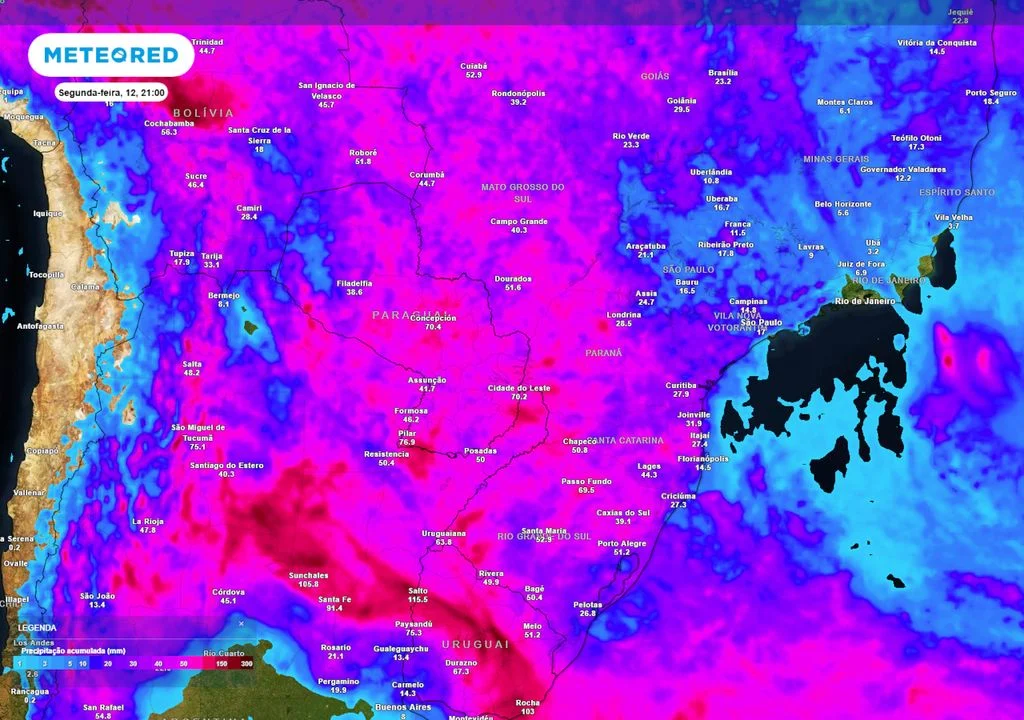 As previsões indicam que os acumulados de chuva podem chegar a 130 milímetros em pontos do Sul do Brasil, incluindo Santa Catarina. Além disso, as rajadas de vento podem ultrapassar os 50 km/h, com picos próximos a 70 km/h entre sábado e domingo.