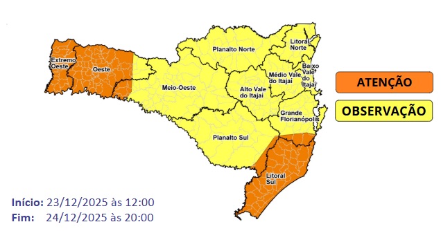 Os temporais ocorrem de forma isolada, principalmente entre o Grande Oeste, Alto Vale do Itajaí e o Sul do estado. Mesmo pontuais, as instabilidades podem trazer chuva intensa em curto período, descargas elétricas, ventos fortes e granizo localizado.